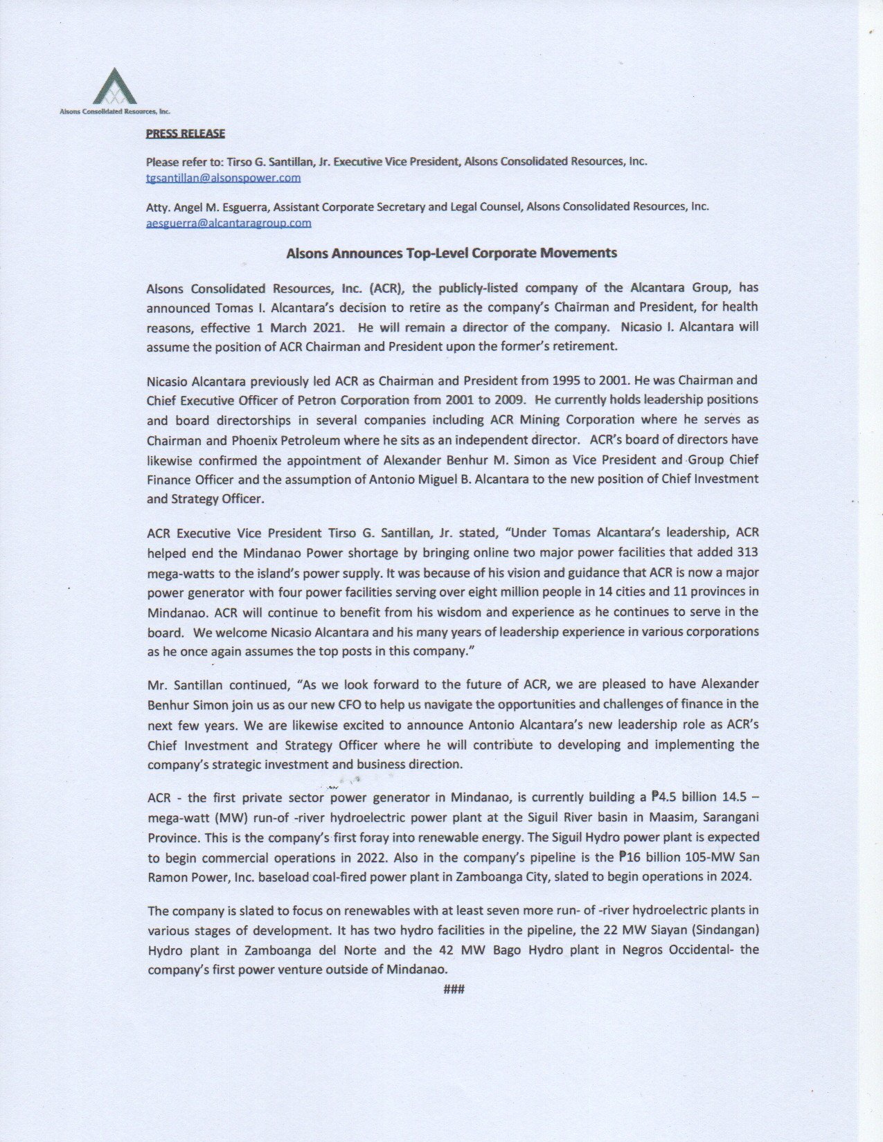 Alsons Announces Top-Level Corporate Movements