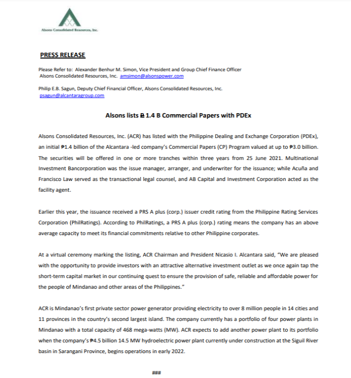 ACR Press Release entitled: Alsons lists ₱ 1.4 B Commercial Papers with PDEx