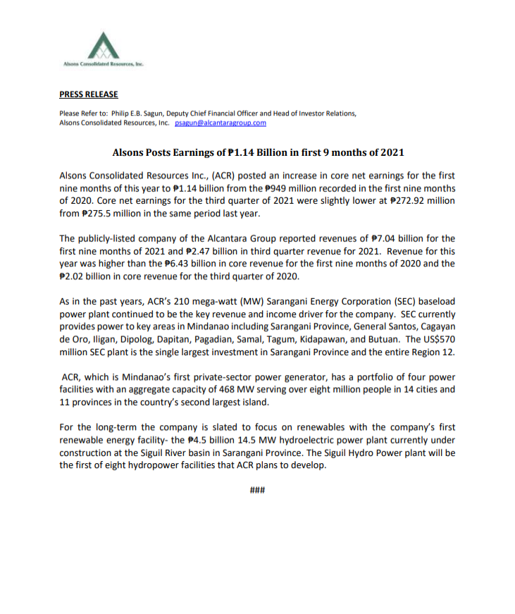 ACR Press Release entitled: Alsons Posts Earnings of ₱ 1.14 Billion in first 9 months of 2021