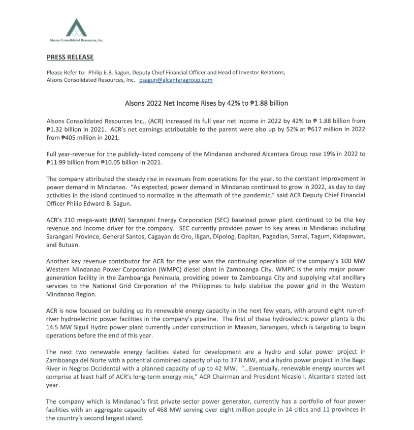 Alsons 2022 Net Income Rises by 42% to ₱ 1.88 billion