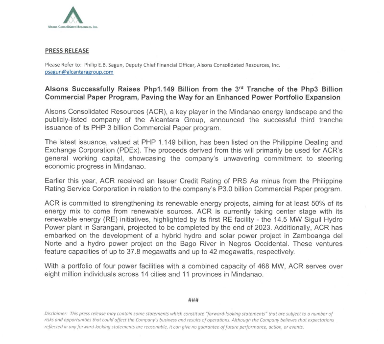 Alsons Successfully Raises ₱ 1.149 Billion from 3rd Tranche of the ₱ 3 Billion Commercial Paper Program Paving the Way for an Enhanced Power Portfolio Expansion