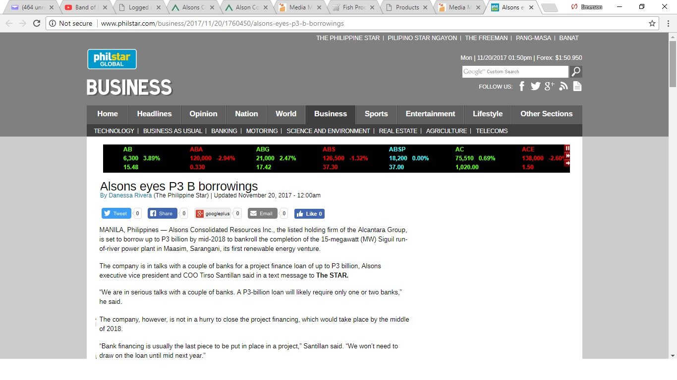 MANILA, Philippines — Alsons Consolidated Resources Inc., the listed holding firm of the Alcantara Group, is set to borrow up to P3 billion by mid-2018 to bankroll the completion of the 15-megawatt (MW) Siguil run-of-river power plant in Maasim, Sarangani, its first renewable energy venture.