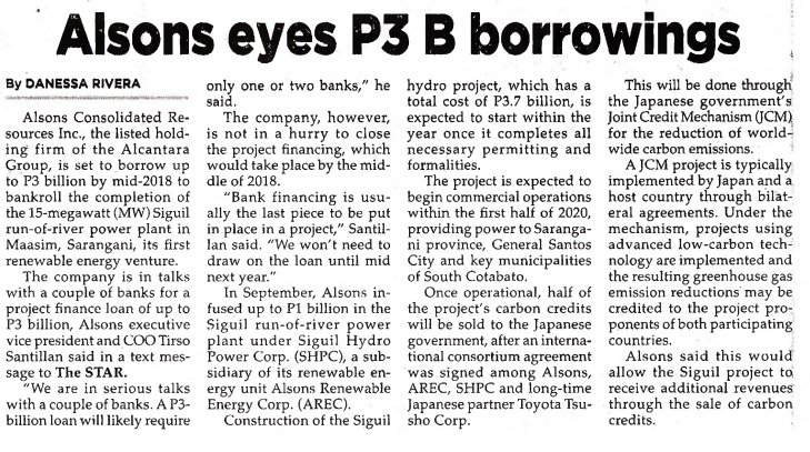 Alsons Consolidated Resources Inc. , the listed holding firm of the Alcantara Group, is set to borrow up to P3 billion by mid-2018 to bankroll the completion of the 15-megawatt (MW) Siguil run-of-river power plant in Maasim, Sarangani, its first renewable energy venture