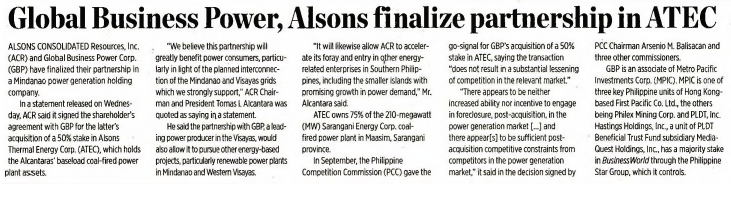 ALSONS CONSOLIDATED Resources, Inc. (ACR) and Global Business Power Corp. (GBP) have finalized their partnership in a Mindanao power generation holding company